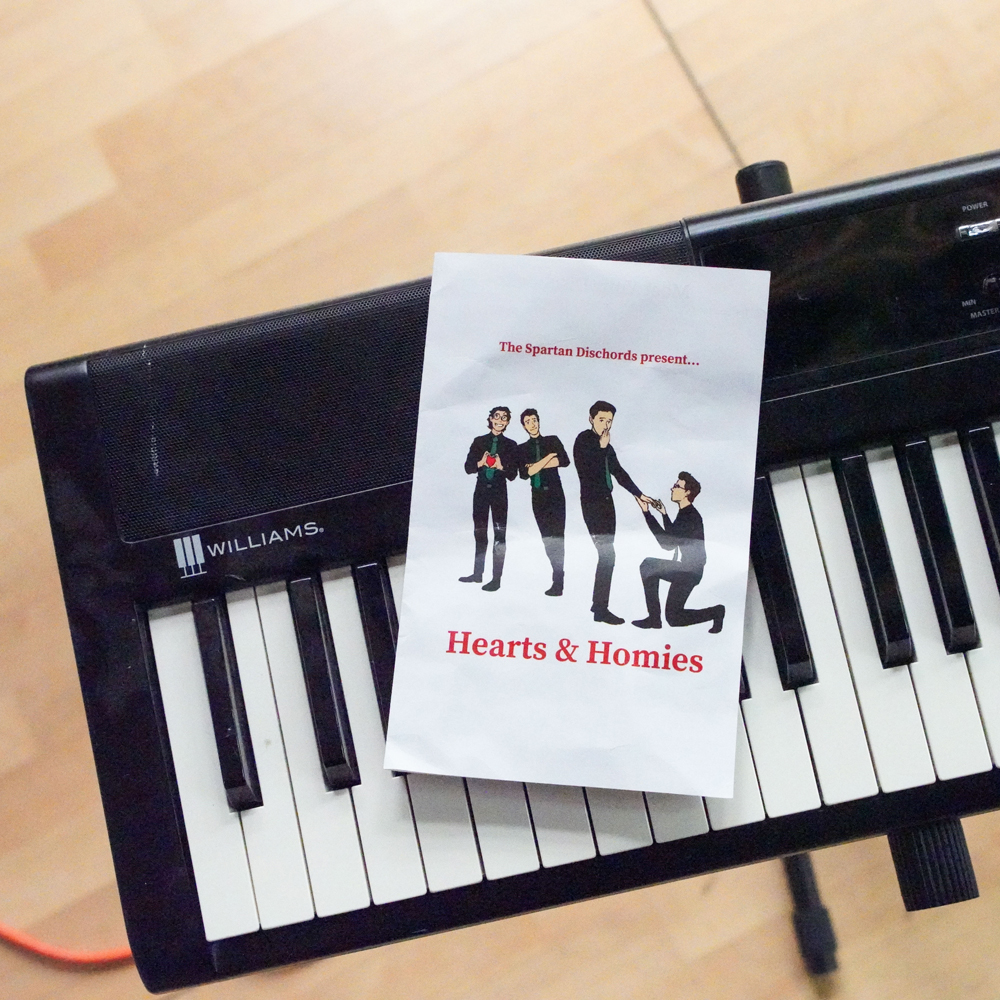 The Spartan Dischords' Valentine's Day concert, "Hearts &Homies" program placed on a piano in East Lansing, MI. Photo by Keerthi Morisetty